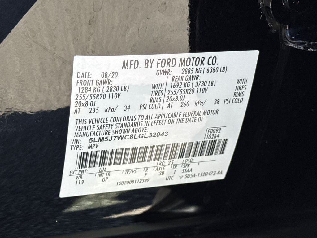 Bluetooth®..., Nationwide Shipping Available, 14 Speakers, 2nd Row Bench Seat, 3.58 Axle Ratio, 3rd row seats: split-bench, 4-Wheel Disc Brakes, ABS brakes, Air Conditioning, AM/FM radio: SiriusXM, Audio memory, Auto High-beam Headlights, Auto-dimming door mirrors, Auto-dimming Rear-View mirror, Automatic temperature control, Brake assist, Bumpers: body-color, Compass, Delay-off headlights, Driver door bin, Driver vanity mirror, Dual front impact airbags, Dual front side impact airbags, Electronic Stability Control, Elements Package Plus, Emergency communication system: SYNC 3 911 Assist, Equipment Group 200A, Four wheel independent suspension, Front anti-roll bar, Front Bucket Seats, Front Center Armrest, Front dual zone A/C, Front fog lights, Front reading lights, Fully automatic headlights, Garage door transmitter, Heated door mirrors, Heated front seats, Heated Steering Wheel, Heated VisioBlade Wipers, Heated/Ventilated 2nd Row Outboard Seats, Heated/Ventilated Driver & Passenger Seats, HVAC memory, Illuminated entry, Knee airbag, Low tire pressure warning, Memory seat, Navigation System, Occupant sensing airbag, Outside temperature display, Overhead airbag, Overhead console, Panic alarm, Panoramic Vista Roof w/Power Shade, Passenger door bin, Passenger vanity mirror, Power door mirrors, Power driver seat, Power Liftgate, Power passenger seat, Power steering, Power windows, Premium Leather Enhanced Micro-Perforated Seats, Radio data system, Radio: Revel AM/FM Audio System w/14 Speakers, Rain sensing wipers, Rear air conditioning, Rear anti-roll bar, Rear audio controls, Rear dual zone A/C, Rear reading lights, Rear window defroster, Rear window wiper, Remote keyless entry, Security system, SiriusXM Radio, Speed control, Speed-Sensitive Wipers, Split folding rear seat, Spoiler, Steering wheel memory, Steering wheel mounted A/C controls, Steering wheel mounted audio controls, SYNC 3 Communication & Entertainment System, Tachometer, Telescoping steering wheel, Tilt steering wheel, Traction control, Trip computer, Turn signal indicator mirrors, Variably intermittent wipers, Ventilated front seats, Wheels: 20 Bright Machined Aluminum.