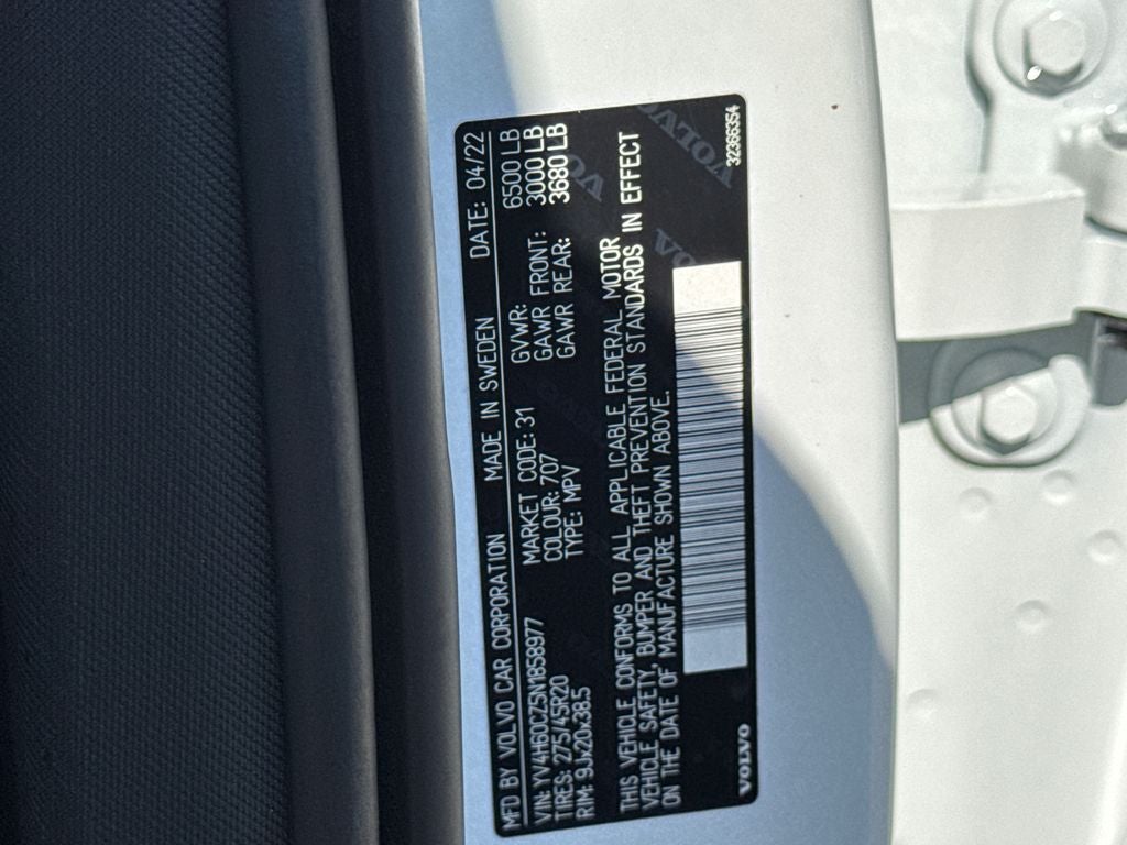 Bluetooth®..., Nationwide Shipping Available, 10 Speakers, 20 Alloy Wheels, 3rd row seats: bucket, 4-Wheel Disc Brakes, ABS brakes, Air Conditioning, AM/FM radio: SiriusXM, Anti-whiplash front head restraints, Apple CarPlay/Android Auto, Auto High-beam Headlights, Auto-dimming door mirrors, Auto-dimming Rear-View mirror, Automatic temperature control, Bodyside moldings, Brake assist, Bumpers: body-color, Delay-off headlights, Driver door bin, Driver vanity mirror, Dual front impact airbags, Dual front side impact airbags, Electronic Stability Control, Emergency communication system: Volvo Cars App w/4 Year Subscription, Exterior Parking Camera Rear, Four wheel independent suspension, Front anti-roll bar, Front Bucket Seats, Front Center Armrest w/Storage, Front dual zone A/C, Front Heated Bucket Seats, Front reading lights, Fully automatic headlights, Garage door transmitter: HomeLink, Genuine wood dashboard insert, Genuine wood door panel insert, harman/kardon Premium Sound, Heated door mirrors, Heated front seats, Illuminated entry, Knee airbag, Leather Upholstery, Low tire pressure warning, Memory seat, Navigation system: Sensus Navigation, Occupant sensing airbag, Outside temperature display, Overhead airbag, Panic alarm, Passenger door bin, Passenger vanity mirror, Power door mirrors, Power driver seat, Power moonroof, Power passenger seat, Power steering, Power windows, Premium audio system: Sensus Connect, Radio data system, Radio: High Performance Audio System, Rain sensing wipers, Rear air conditioning, Rear anti-roll bar, Rear dual zone A/C, Rear fog lights, Rear reading lights, Rear seat center armrest, Rear window defroster, Rear window wiper, Remote keyless entry, Security system, Speed control, Speed-sensing steering, Split folding rear seat, Spoiler, Steering wheel mounted audio controls, Tachometer, Telescoping steering wheel, Tilt steering wheel, Traction control, Trip computer, Turn signal indicator mirrors, Variably intermittent wipers.